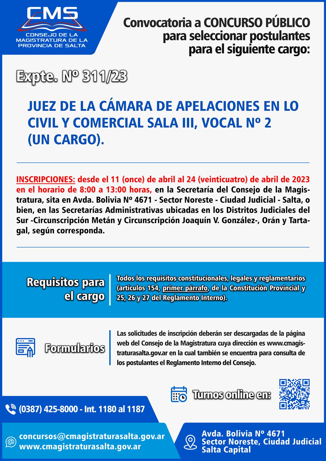 El Consejo de la Magistratura informa que desde el 11 (once) de abril comenzarán las inscripciones para cubrir el cargo de: “Juez de la Cámara de Apelaciones en lo Civil y Comercial Sala III, Vocal N°2” (un cargo), Expte. Nº 311/23.