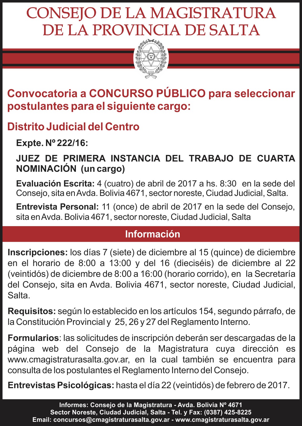 El Consejo de la Magistratura de Salta convoca a concurso público para seleccionar postulantes a cubrir un cargo de juez de Primera Instancia del Trabajo de Cuarta Nominación del Distrito Judicial del Centro.