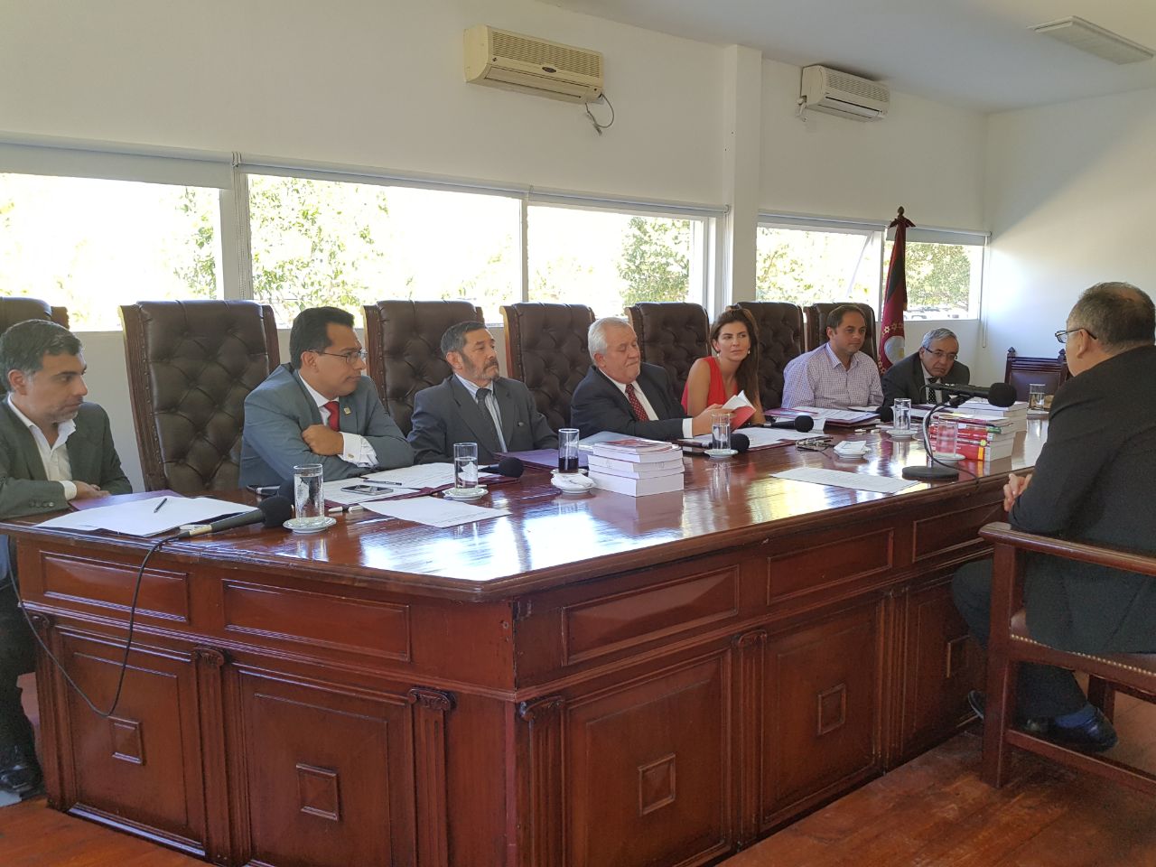 El presidente de la Corte de Justicia, Guillermo Catalano, y los consejeros del cuerpo durante la reunión informativa.