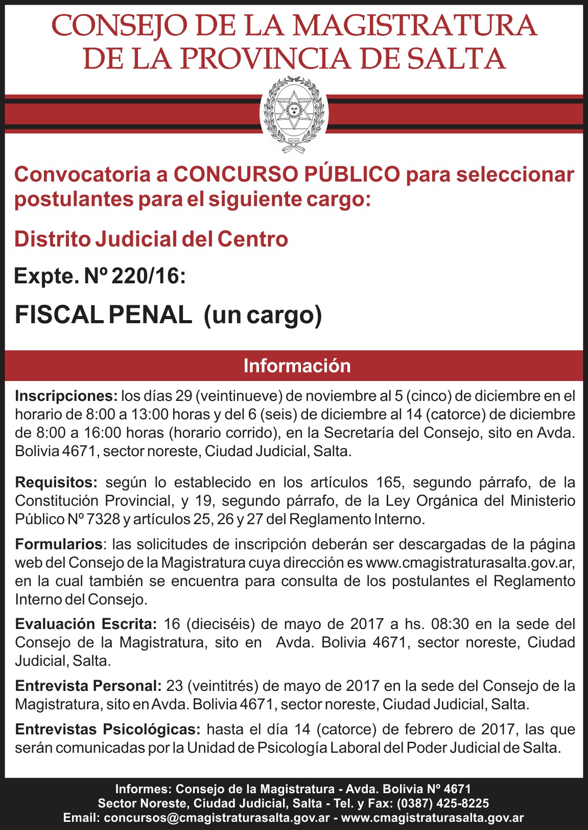 Convocan a concurso para cubrir cargo de Fiscal Penal en el Distrito Centro