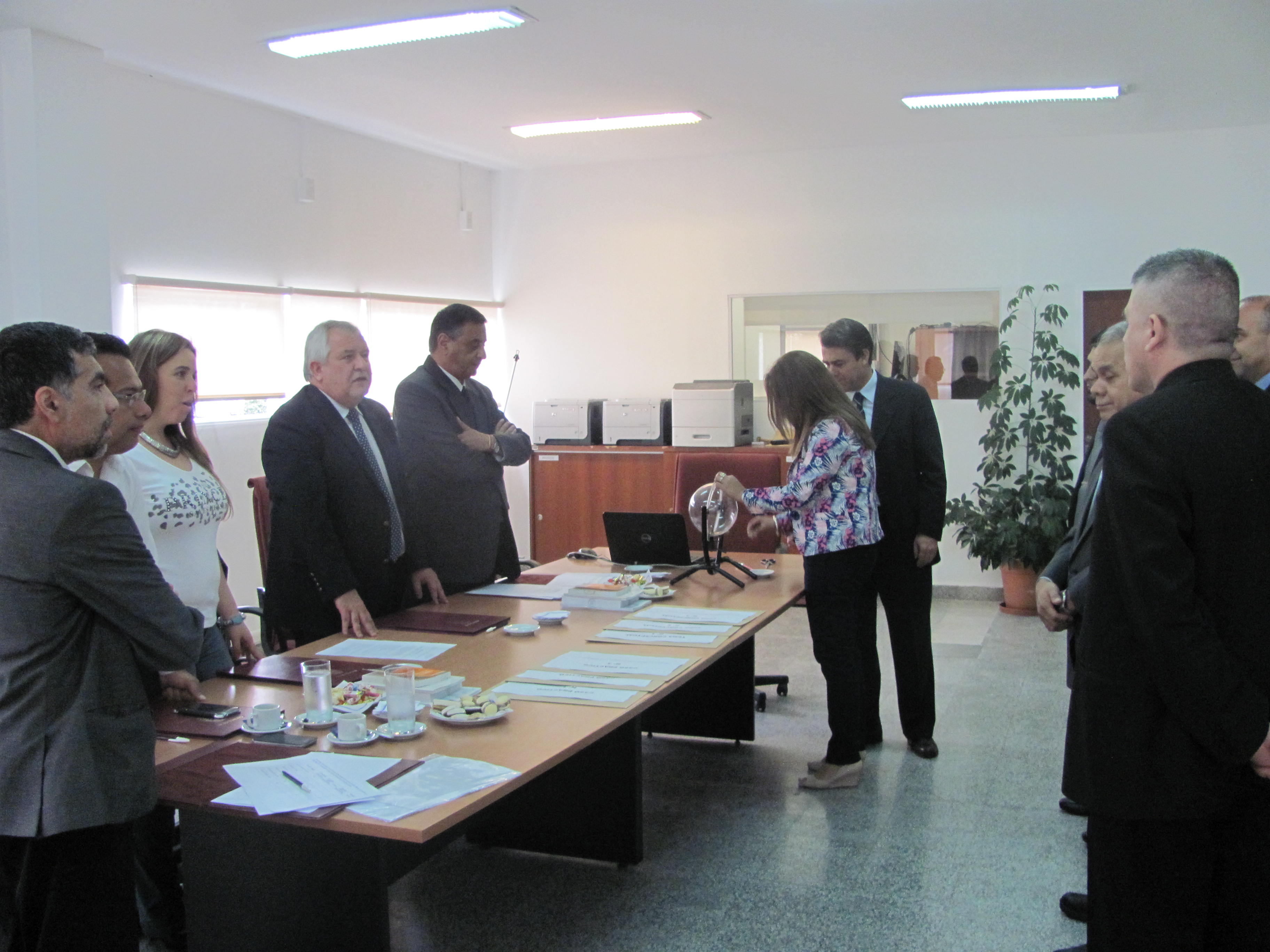 El tribunal presidido por el juez de la Corte, Guillermo Catalano, junto a los concursantes en el momento del sorteo