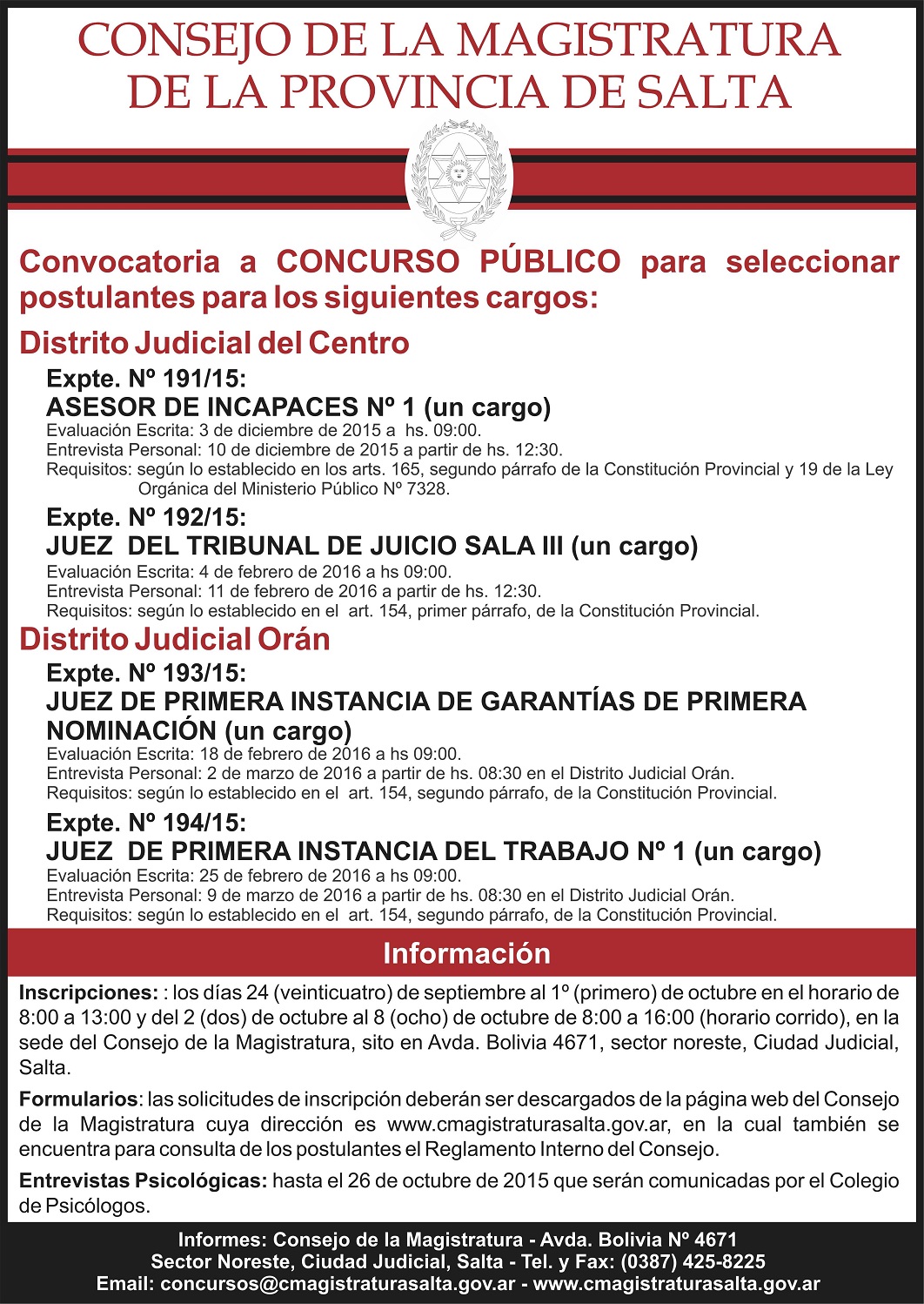Es para cubrir vacantes como Defensor de Juicio y Ejecución de Orán; juez de Personas y Familia en Metán y