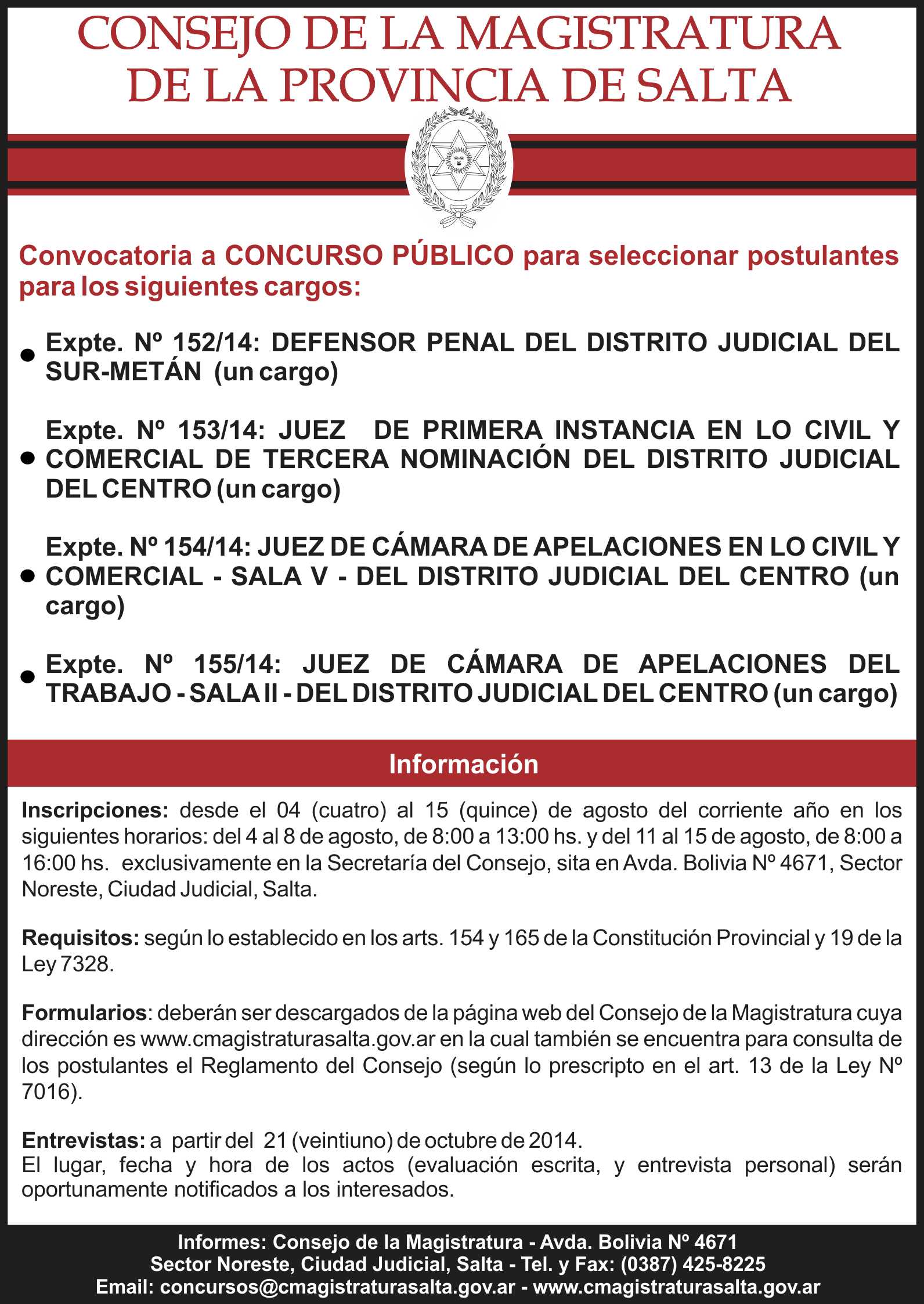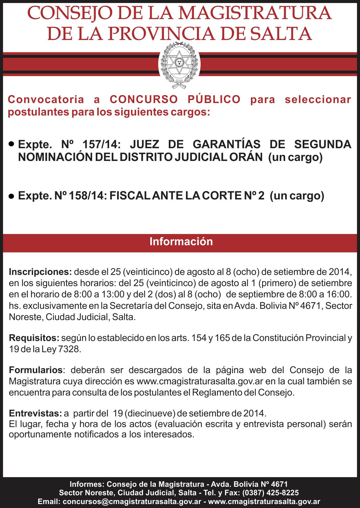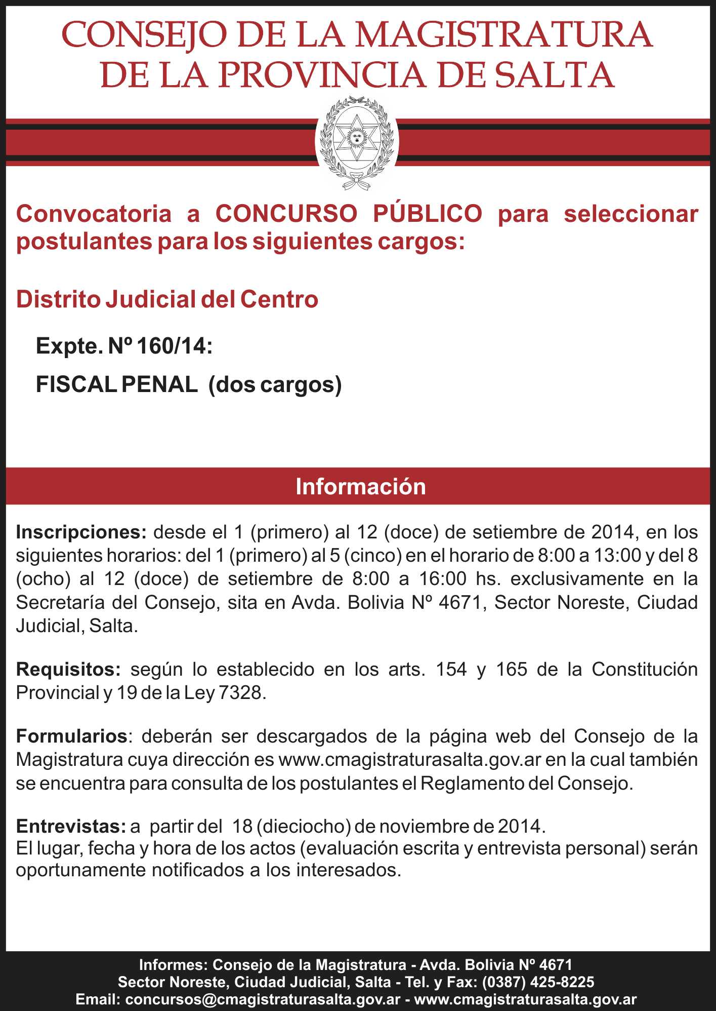 Para cubrir dos Cargos de Fiscal Penal - Expte. Nº 160/14