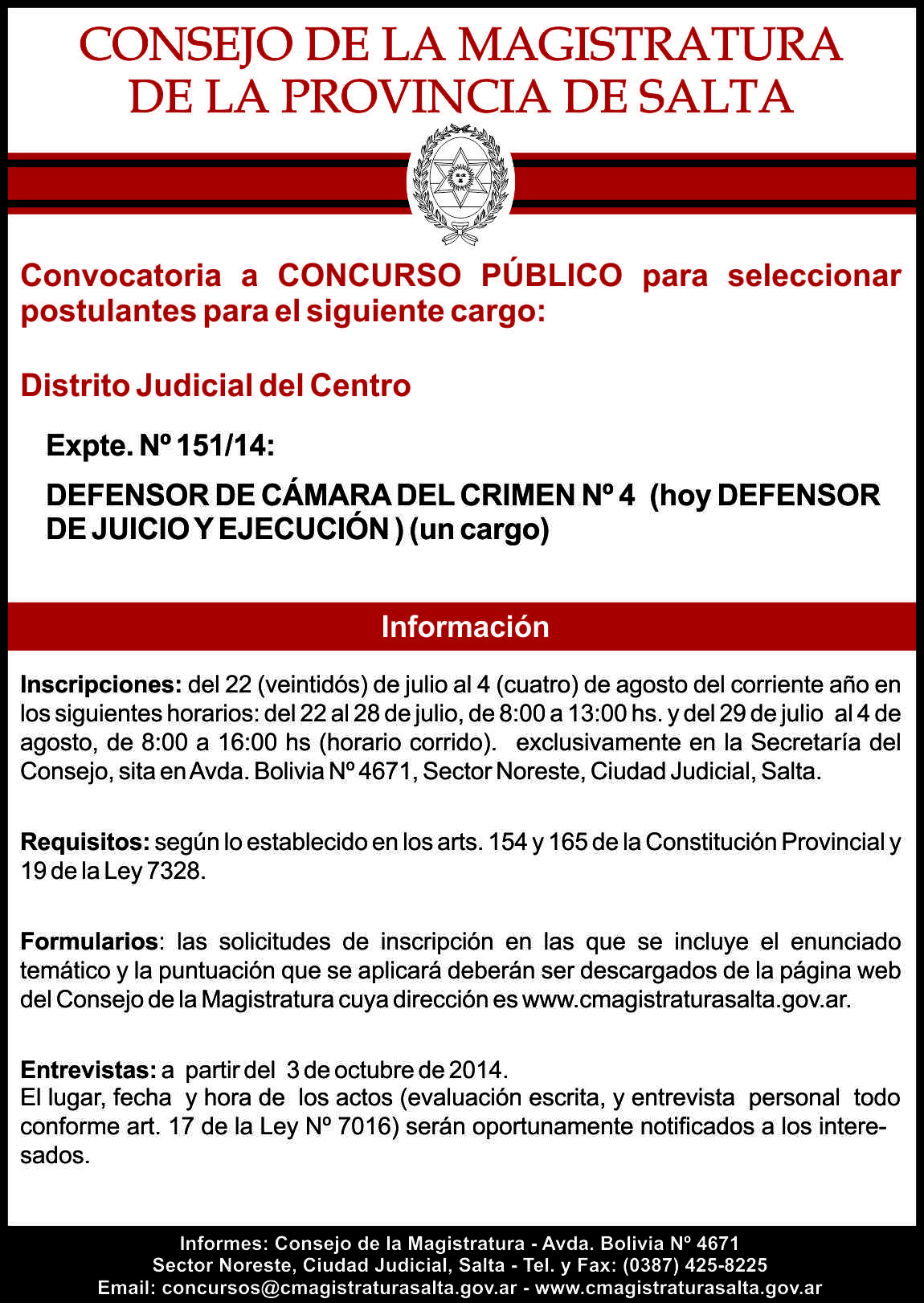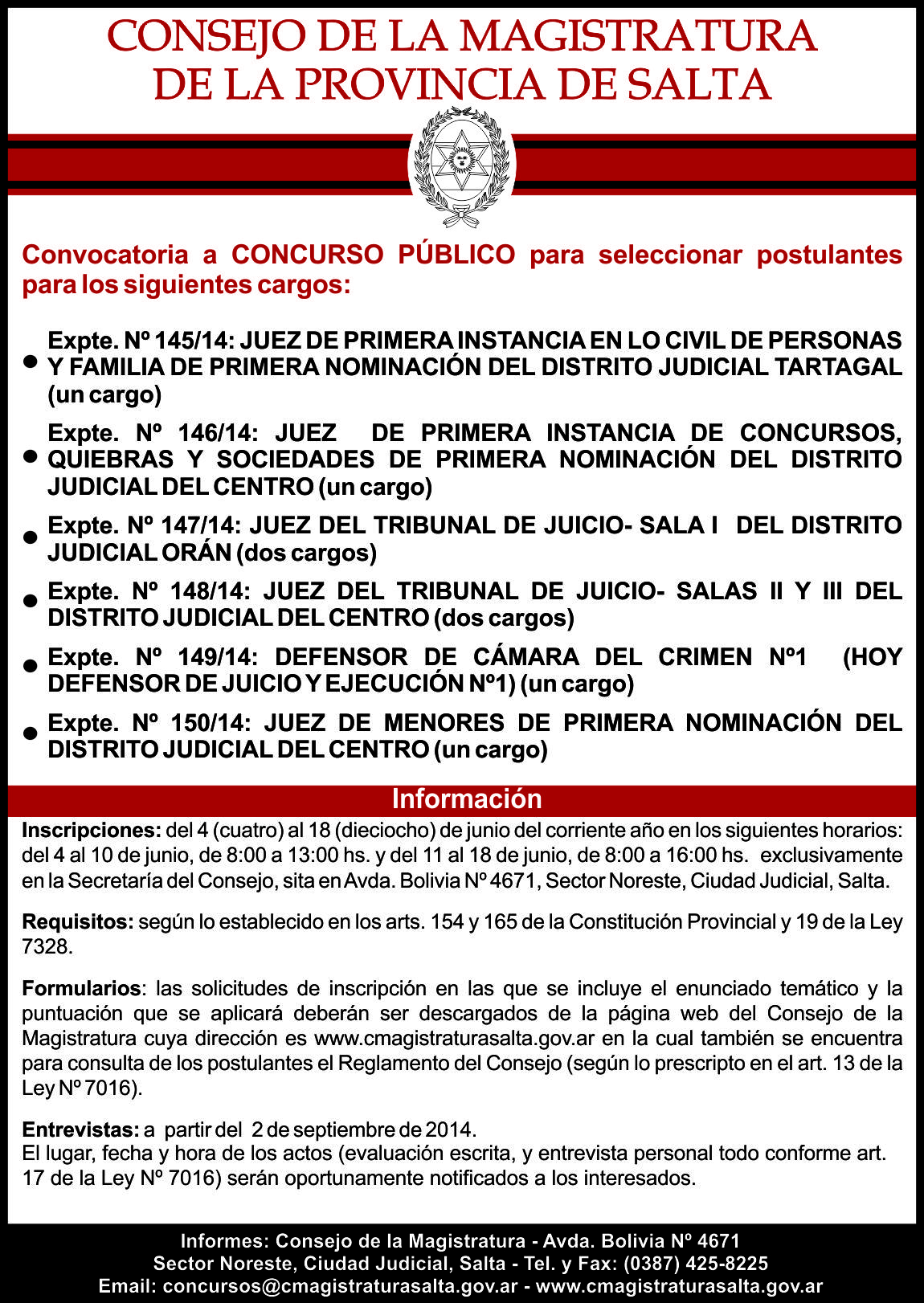 El Consejo de la Magistratura de la Provincia de Salta, hace conocer a la opinión pública que con motivo de